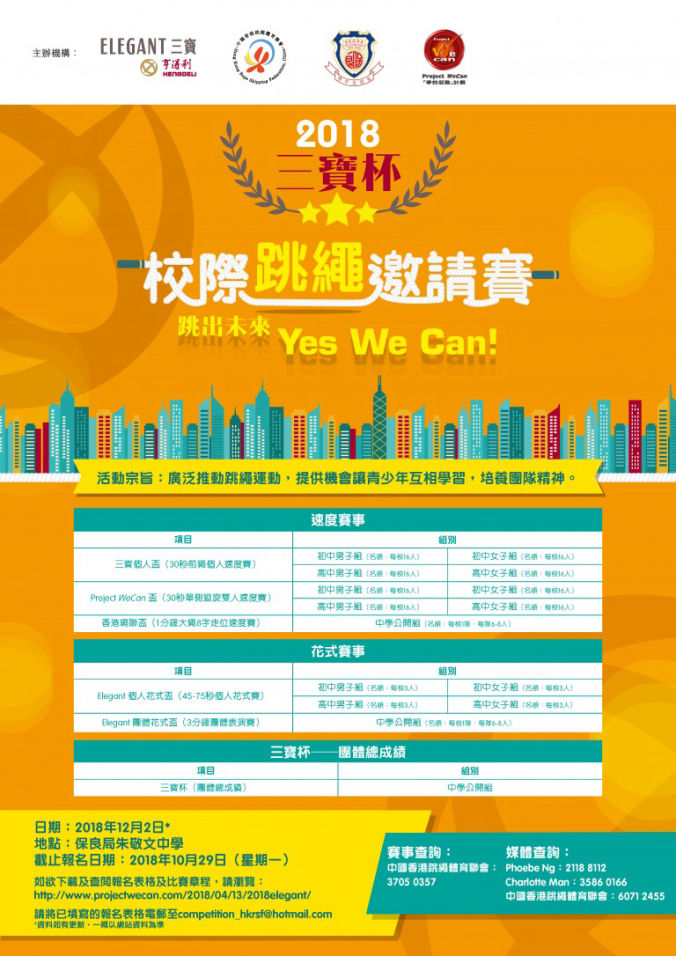 為促進校園跳繩運動發展,本會聯同三寶鐘錶珠寶、Project WeCan以及保良局朱敬文中學舉辦「2018三寶杯校際跳繩邀請賽」,讓本地學生同場競技,推動校園跳繩普及化。