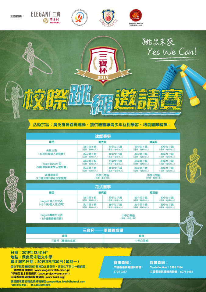為促進校園跳繩運動發展,本會聯同三寶鐘錶珠寶、Project WeCan以及保良局朱敬文中學舉辦「2019三寶杯校際跳繩邀請賽」,讓本地學生同場競技,推動校園跳繩普及化。