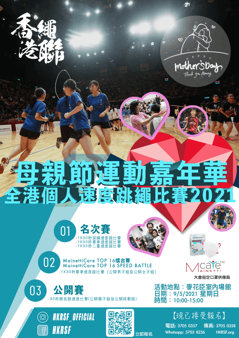 香港繩聯於疫情下第一個實體比賽,將會以全新形式推出。本賽事設有名次賽、親子賽、和最佳十六強入選的擂台賽。 活動緊張刺激,歡迎各運動員積極參與。同時,活動正值母親節期間,比賽舉辦於母親節運動嘉年華內,當中有多項運動體驗、攤位和市集。歡迎帶同親友體驗。