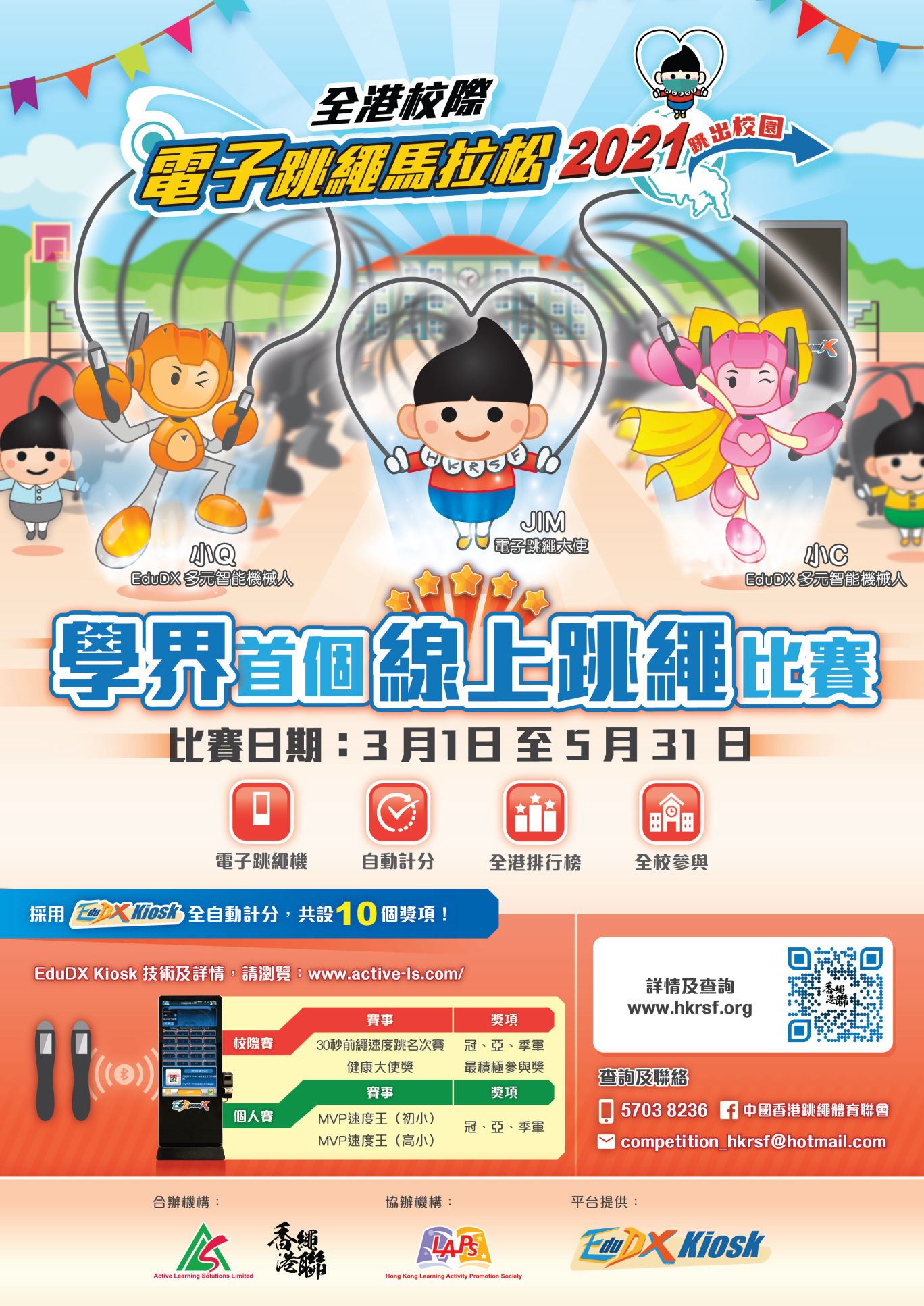 中國香港跳繩體育聯會聯同香港欣學教育科技有限公司舉辦「全港校際電子跳繩馬拉松2021」,在使用EduDX Kiosk電子技術平台下,將成為全港首個結合電子科技的跳繩比賽,運動員可於學校內進行跨校比賽、查看即時成績、一Click即跳。在維持社交距離下仍能繼續跳繩比賽,目的除了是為一眾受影響的運動員提供比賽平台外,更有著鼓勵香港人於疫情中保持正面的意義。