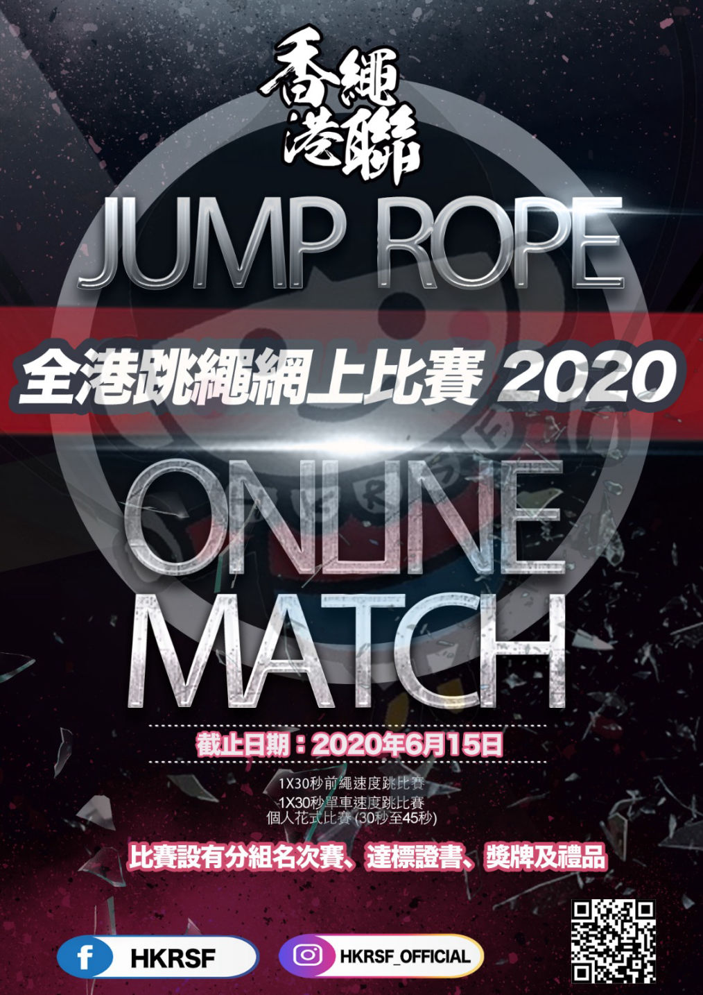 中國香港跳繩體育聯會將於2020 年5 月至6 月期間舉辦「全港跳繩網上比賽2020」,為一眾跳繩運 動員提供一個網上比賽平台,讓大家展示過去一段時間苦練了的跳繩花式和速度項目,並不會因今 年的特殊情況而浪費心血,比賽以影片形式進行,每名參賽者透過網絡上載比賽項目,並可參加多 個比賽項目。